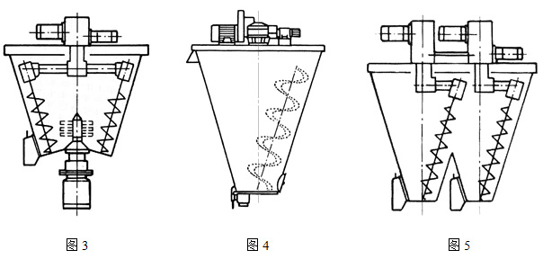 7、如圖5所示兩錐體結(jié)合成一體,為雙錐雙螺旋結(jié)構(gòu)。此結(jié)構(gòu)可在保持體積不變的同時,大大降低錐體的高度,適合于設(shè)備的大型化及大生產(chǎn)。