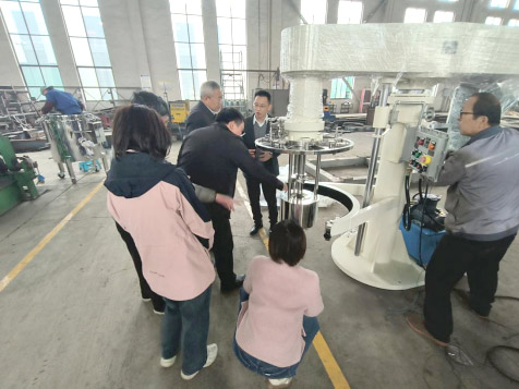 隨后,各位領(lǐng)導(dǎo)駐足真空籃式研磨機(jī)旁,深入了解設(shè)備的工作原理與應(yīng)用場(chǎng)景。該設(shè)備通過高速旋轉(zhuǎn)的研磨器帶動(dòng)研磨介質(zhì)與物料產(chǎn)生強(qiáng)烈剪切、碰撞,配合泵葉的吸力與分散盤的分散作用,可在短時(shí)間內(nèi)實(shí)現(xiàn)物料的精細(xì)研磨,同時(shí)能根據(jù)生產(chǎn)工藝需求靈活控制產(chǎn)品溫度,廣泛應(yīng)用于涂料、精細(xì)化工等領(lǐng)域,憑借高效、穩(wěn)定的性能獲得行業(yè)認(rèn)可。此外,易董還向各位領(lǐng)導(dǎo)介紹了各類機(jī)器重要部件的研發(fā)與生產(chǎn)工藝,展現(xiàn)了索孚科技在設(shè)備制造環(huán)節(jié)的嚴(yán)謹(jǐn)與專業(yè)。