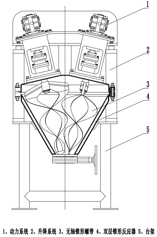 雙錐體是將兩個(gè)錐形容器通過(guò)一定的夾角拼接成“∞”形的雙聯(lián)錐體,其目的是在有限的空間內(nèi)增加攪拌混合面積,在反應(yīng)器內(nèi)形成多方向螺旋混合流,減少物料的反應(yīng)死角等,用以達(dá)到高粘物料的充分混合或反應(yīng),同時(shí)方便超高粘物料的出料和清潔清洗。所述無(wú)軸錐形螺帶的傳質(zhì)、傳熱和界面更新的卓越效果,使反應(yīng)空間內(nèi)的物料在上下翻滾與混合時(shí)都沒(méi)有死角,使混合和反應(yīng)更加充分;同時(shí)更不會(huì)因?yàn)檩S的存在使物料在混合(反應(yīng))過(guò)程中在軸心部位因抱軸而形成的殘留死角。