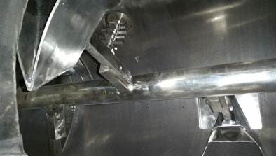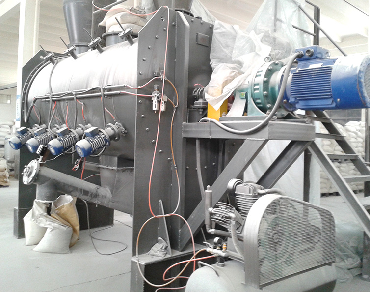 LDH-犁刀混合機(jī),由主動(dòng)輪減速機(jī)帶動(dòng)犁刀組軸運(yùn)動(dòng),一方面將物料沿筒體圓周作徑向周向湍動(dòng),同時(shí)將物料沿犁刀兩側(cè)的法線方向拋出,另一方面被拋出物料經(jīng)飛刀組時(shí),被高速旋轉(zhuǎn)的飛刀剪切攪拌而強(qiáng)烈的拋散,物料在犁刀和飛刀的復(fù)合作用下,不斷更疊、擴(kuò)散,物料在不斷被翻動(dòng)的同時(shí)又互相摻和,因此在極短的時(shí)間內(nèi)達(dá)到均勻的混合。塊狀固—固(粉體與粉體)、固—漿(粉體與膠漿液)的物料或密度差異較大的物料也能混合。