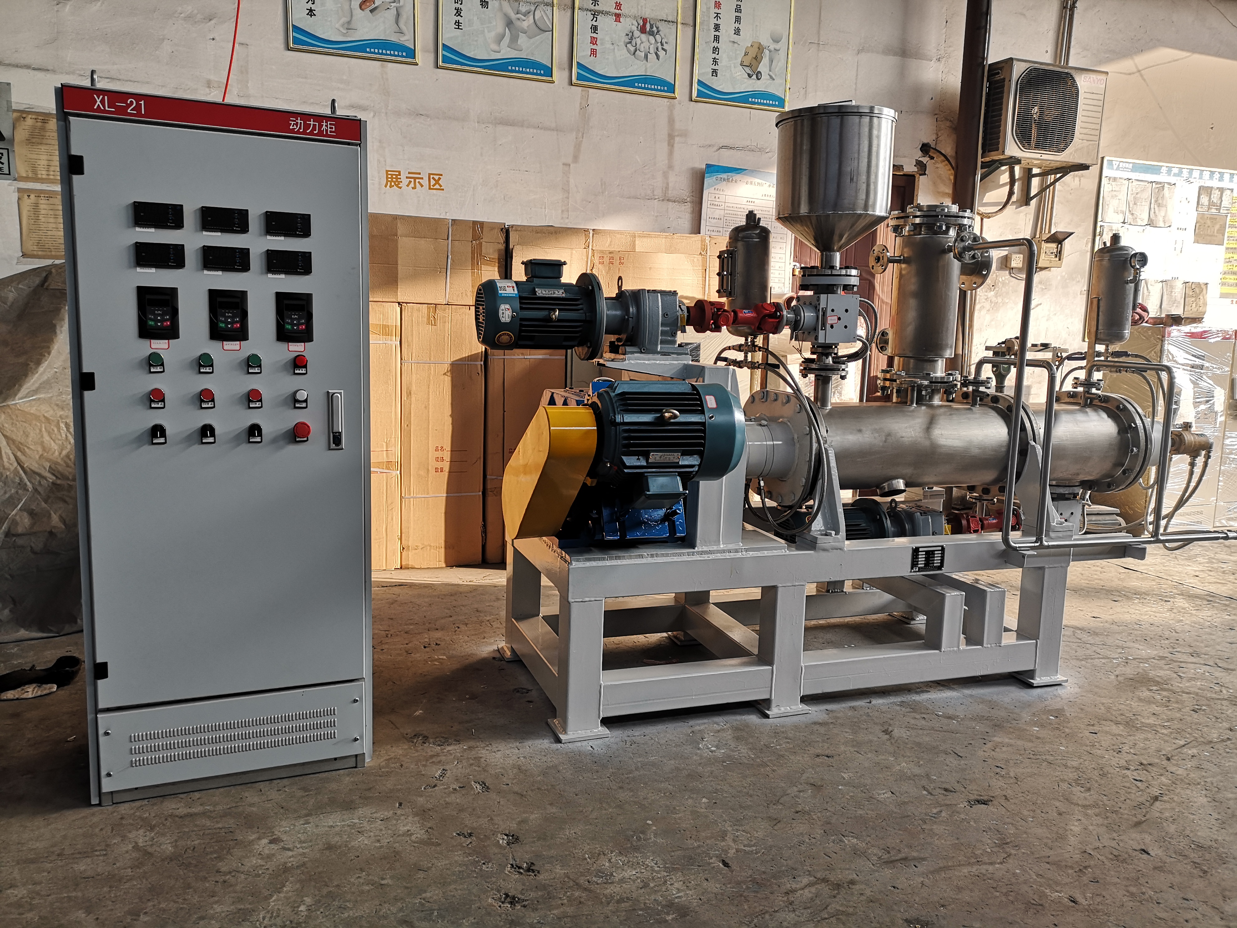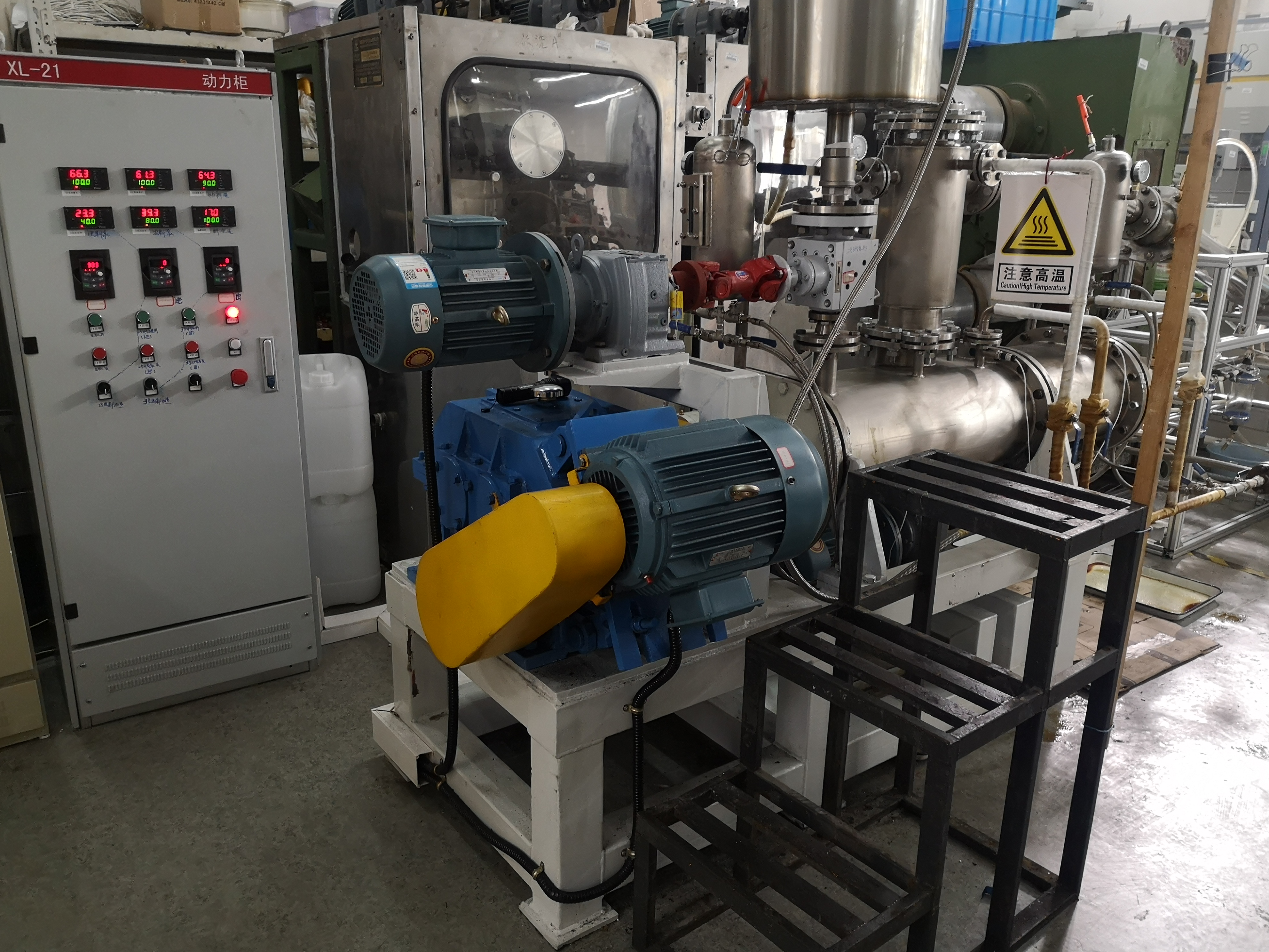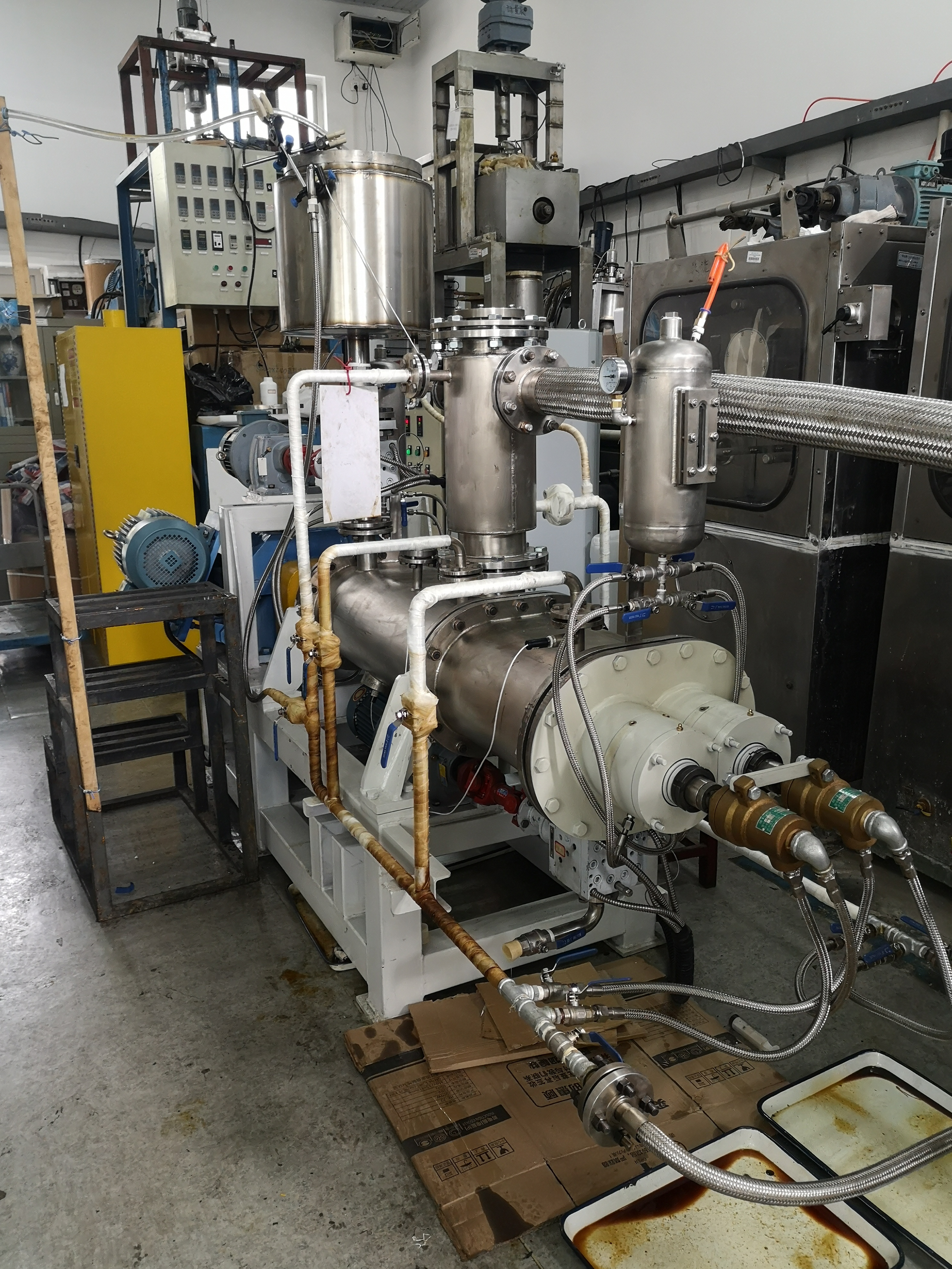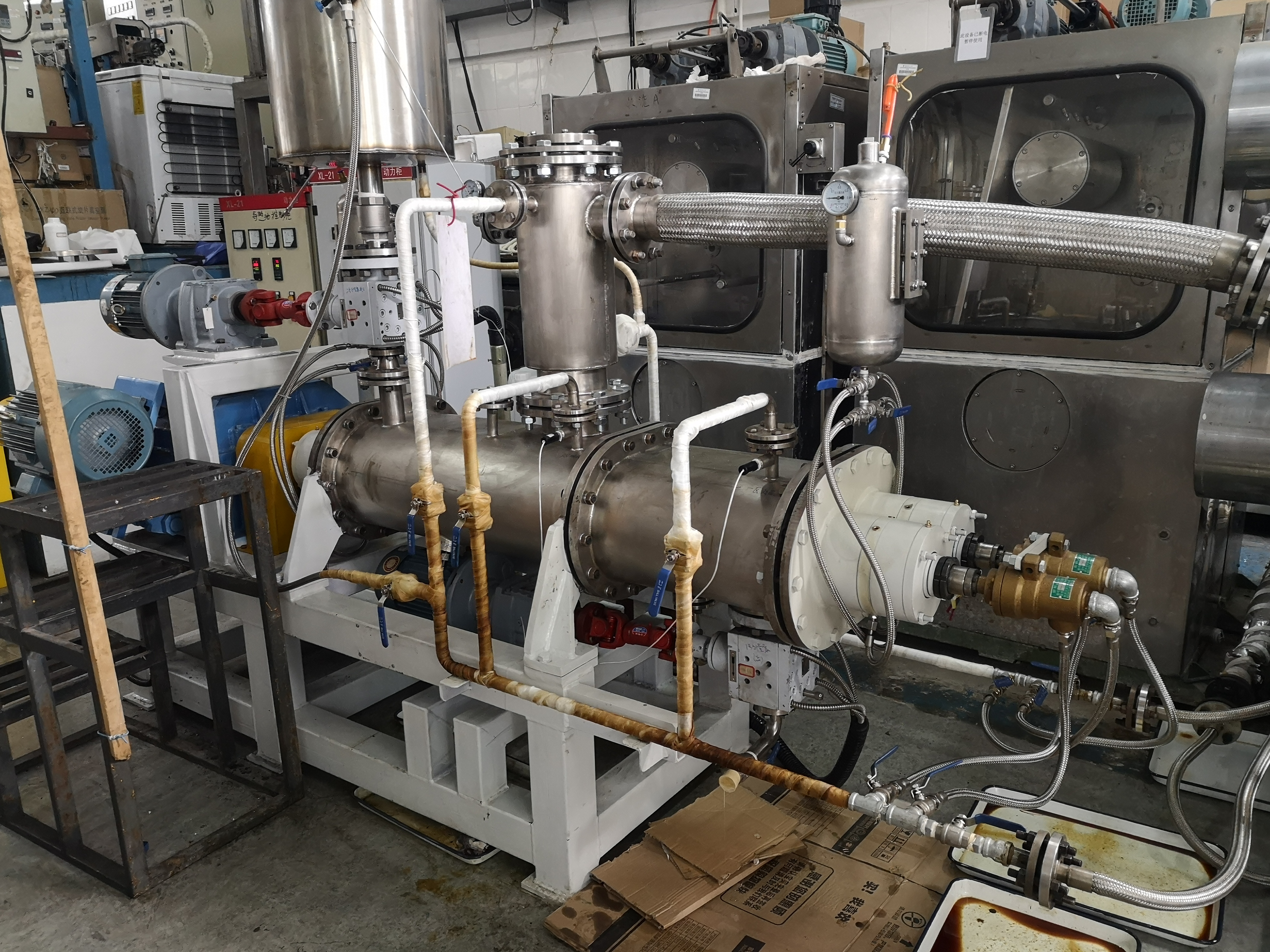 為了適應在真空狀態下的操作,專門安裝了適用于高粘度物料的齒輪泵式出料器。該出料器直接安裝在主設備上,消除了設備內的死角。齒輪泵式出料器在稍微超負荷的條件下工作,以保證物料能連續地排出,并輸入下一工段進行包裝。