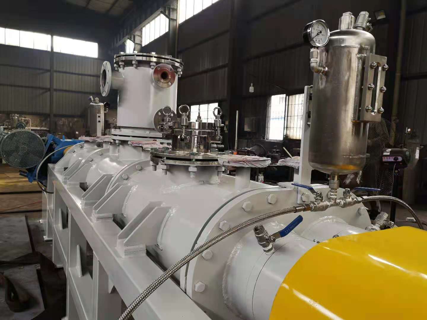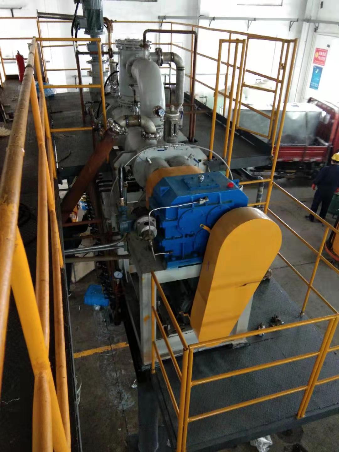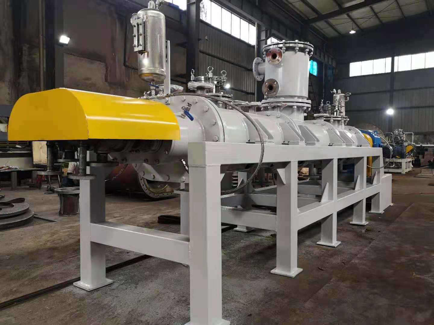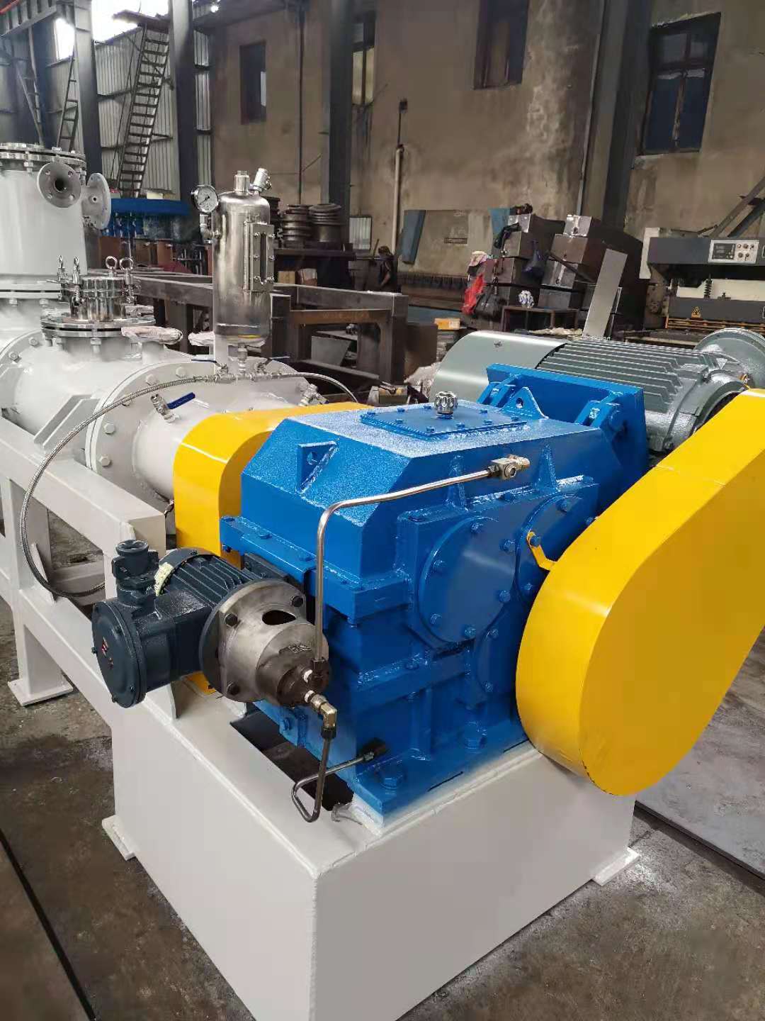 為了適應在真空狀態下的操作,專門安裝了適用于高粘度物料的齒輪泵式出料器。該出料器直接安裝在主設備上,消除了設備內的死角。齒輪泵式出料器在稍微超負荷的條件下工作,以保證物料能連續地排出,并輸入下一工段進行包裝。