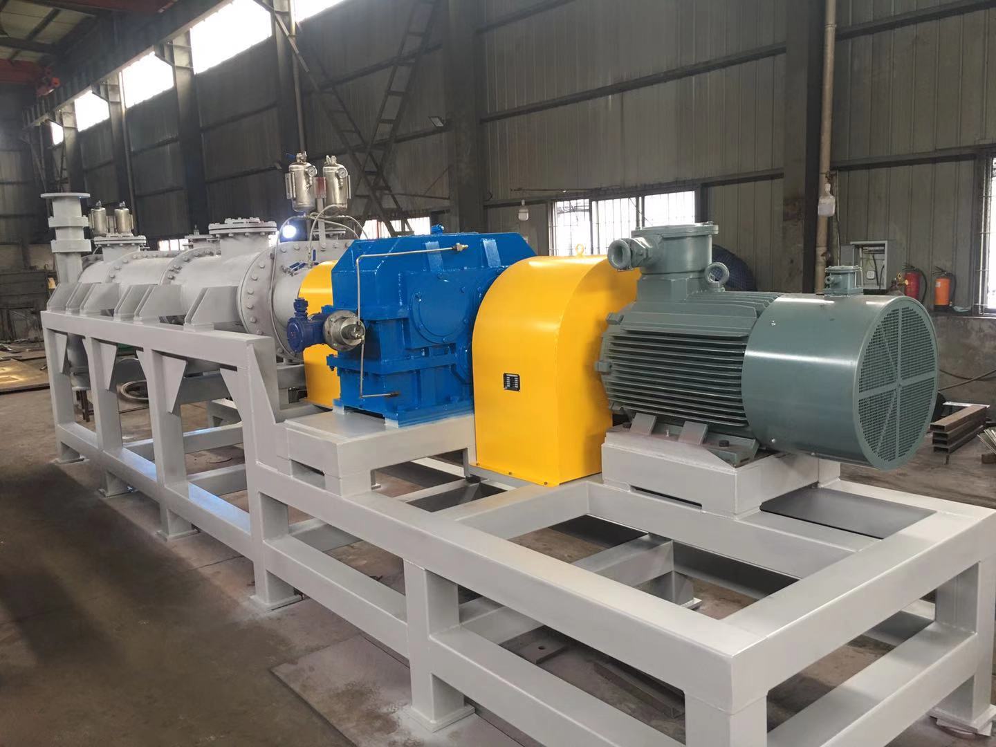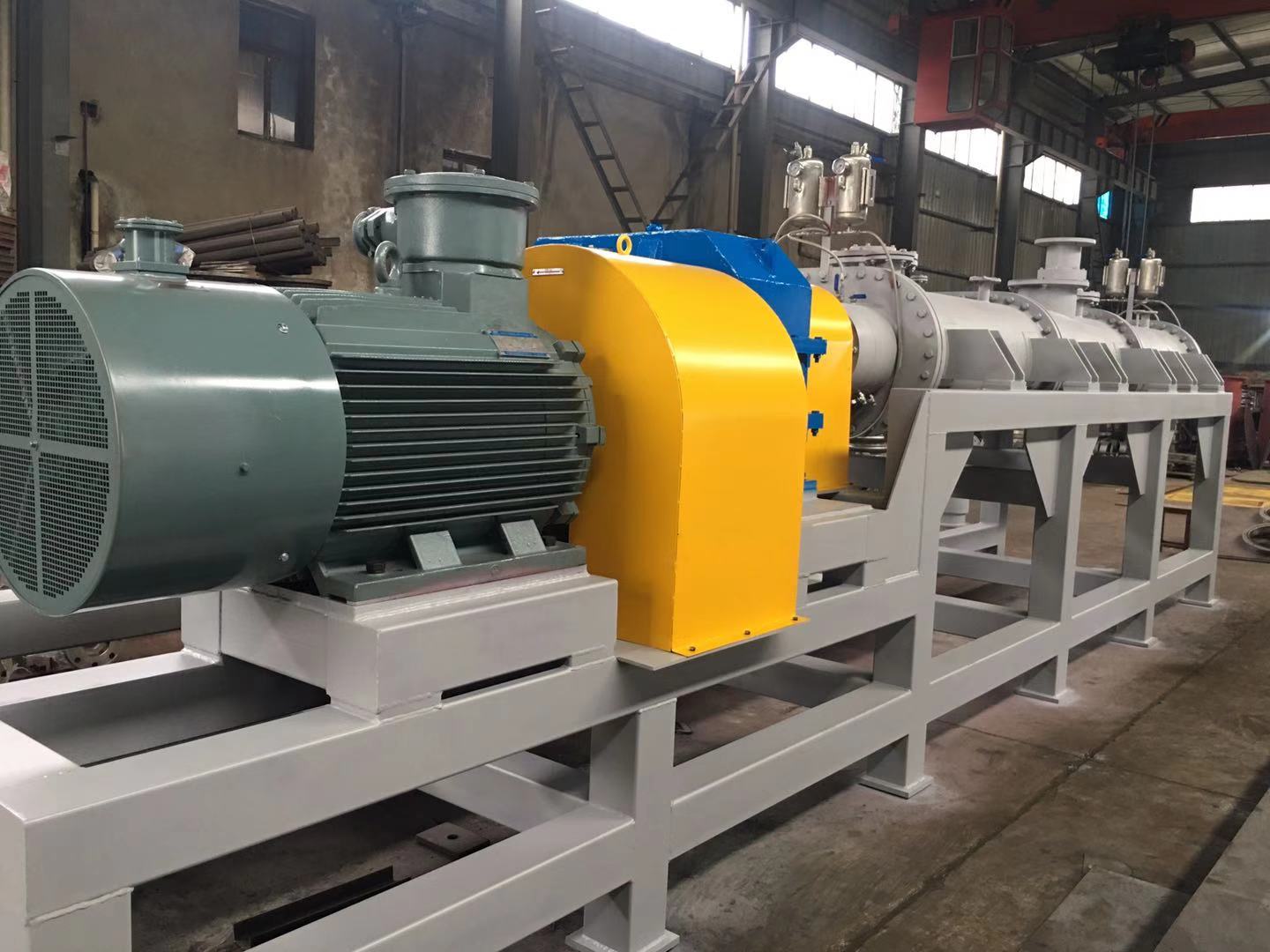 .混合機除夾套有傳熱功能,其主要的傳熱單元還是攪拌軸和攪拌盤,攪拌軸和槳盤中間設(shè)計是空心的,能通入0-300℃?zhèn)鳠峤橘|(zhì)循環(huán),加上攪拌軸的旋轉(zhuǎn),單位時間內(nèi)物料接觸換熱面積增加,使該混合設(shè)備具有高效的傳熱能力.是高粘流體物料反應(yīng),蒸發(fā),干燥,脫輝的首選裝置。