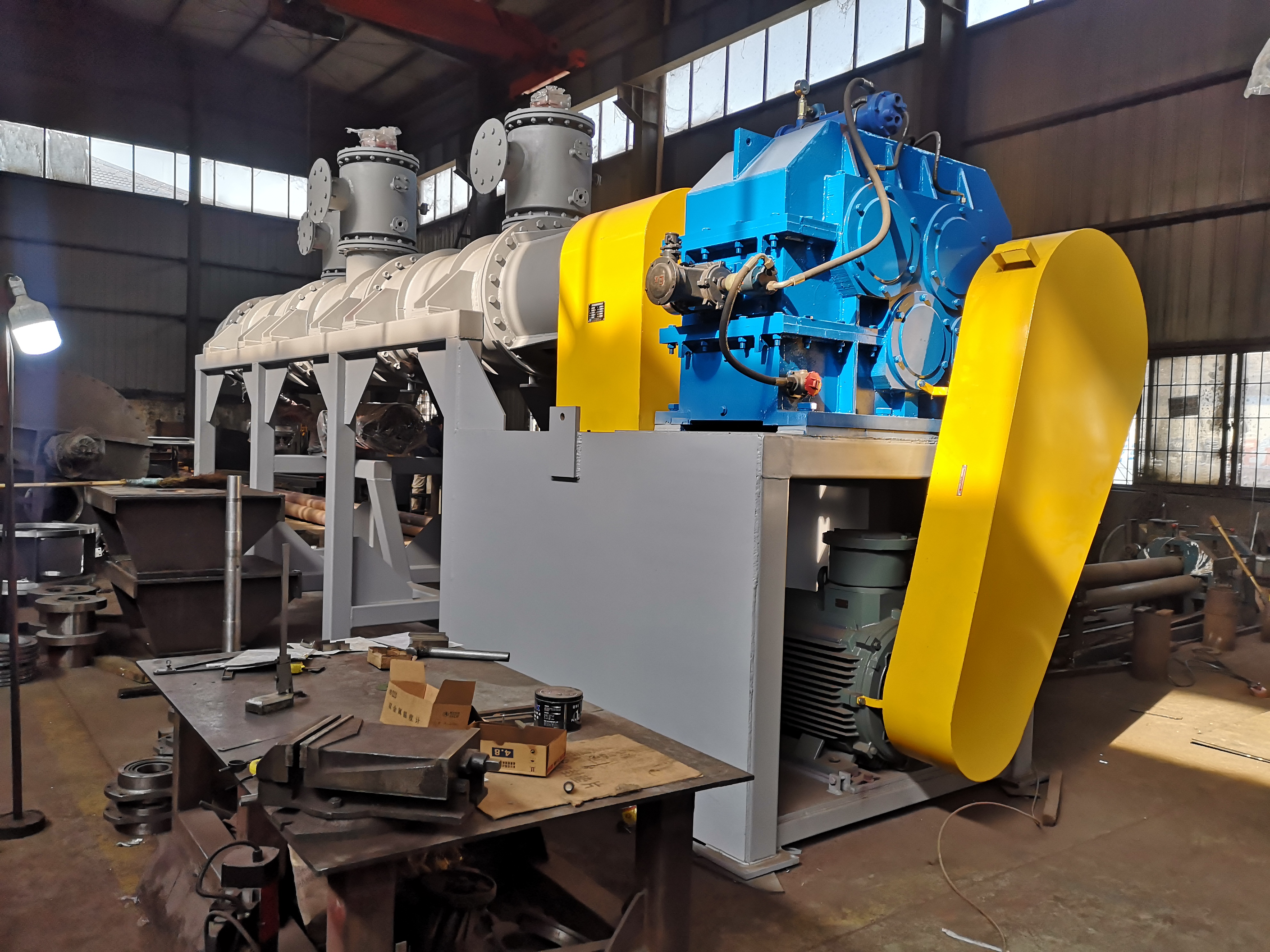 為了適應在真空狀態下的操作,專門安裝了適用于高粘度物料的齒輪泵式出料器。該出料器直接安裝在主設備上,消除了設備內的死角。齒輪泵式出料器在稍微超負荷的條件下工作,以保證物料能連續地排出,并輸入下一工段進行包裝。