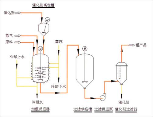 液相催化加氫的工藝流程一般包括氫化反應系統、催化劑過濾系統和其他氫源、取樣、冷卻、產品精制等配套系統,不同工藝需要不同工藝流程和設備。反應系統一般設計成間歇生產,特殊要求時也可設計成連續生產。